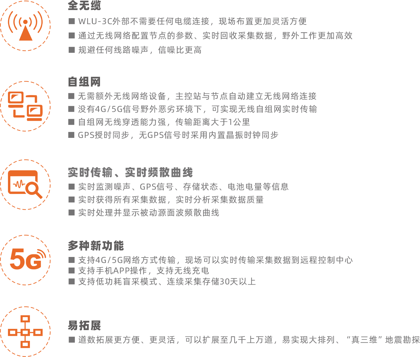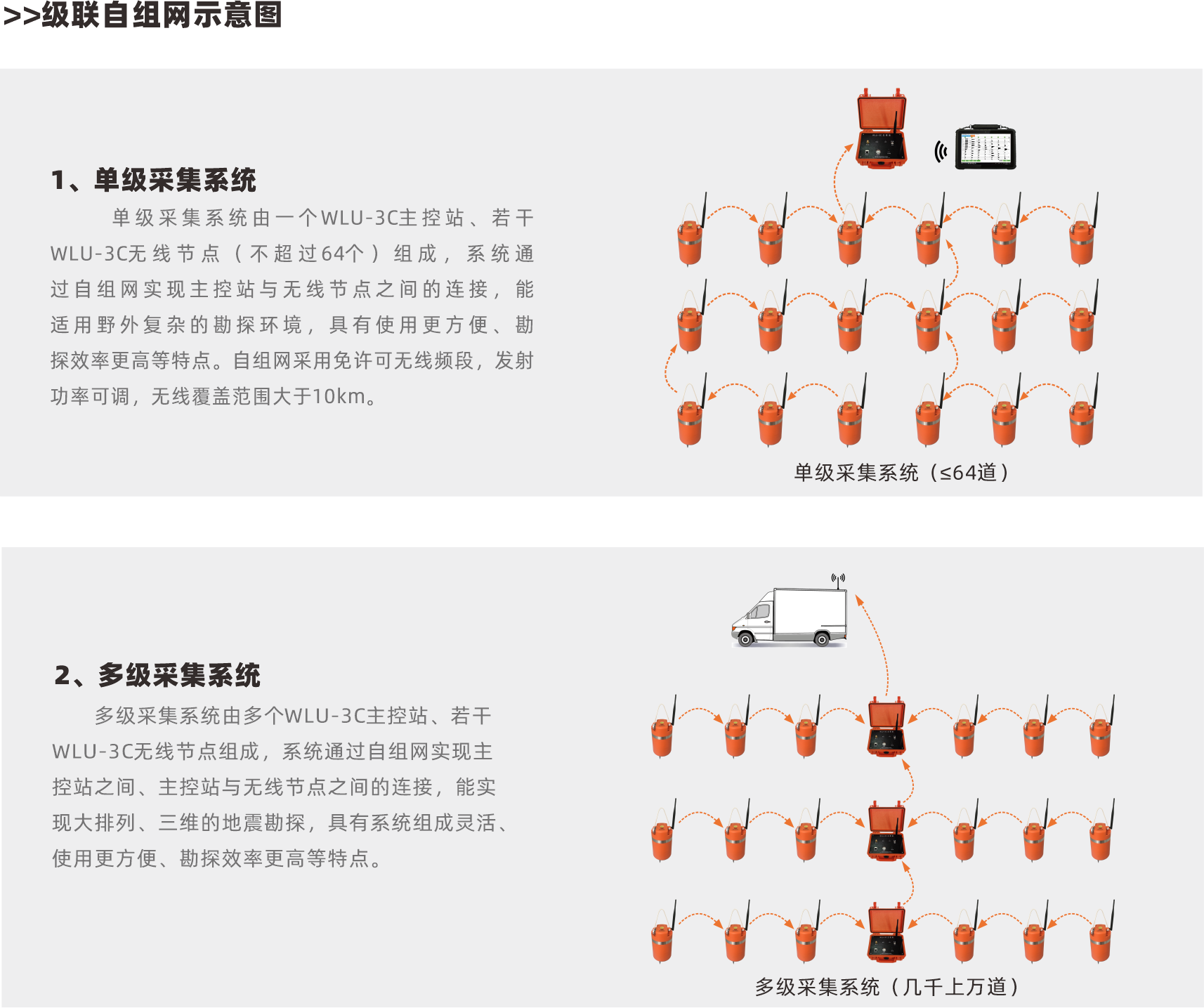 我公司自主研制的WLU-3C無線節(jié)點儀是一款集地震傳感器、采集站、電池、控制、存儲、無線傳輸與狀態(tài)指示于一體的無線節(jié)點式地震儀器,主要功能為傳感器信號數(shù)字化采集、本地存儲、自動組網(wǎng)、數(shù)據(jù)無線高速傳輸。同時兼具穩(wěn)定可靠、抗干擾強、實時傳輸、易拓展、體積小、功耗低、連續(xù)工作時間長(200小時以上)等特點,大幅提升了野外數(shù)據(jù)采集的質(zhì)量和工作效率,尤其適用于河流、水網(wǎng)、湖區(qū)、公路、鐵路等復(fù)雜的勘探環(huán)境。