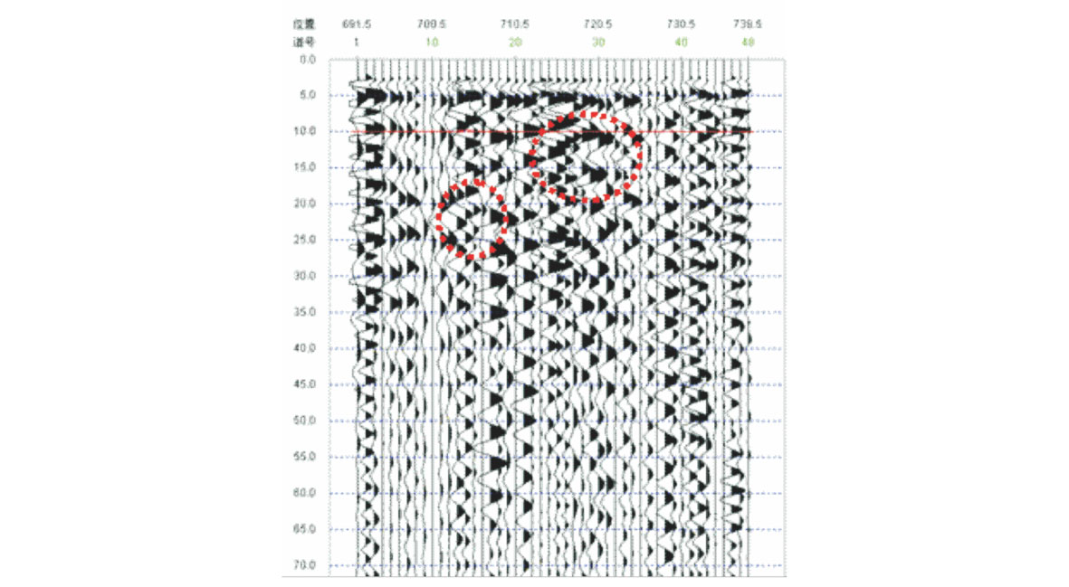 圖中地震波分辨率高,可直觀看出巖溶發(fā)育的確切范圍,也可直接拾取到巖溶發(fā)育的頂板弧狀頂點(diǎn)反射波時(shí)間(+717~+722鉆探溶洞處,頂板反射波時(shí)間約3.5ms左右,按現(xiàn)場(chǎng)測(cè)試平均速度2500m/s計(jì)算頂板深度約為8.7m,可準(zhǔn)確計(jì)算頂板發(fā)育深度,與鉆探結(jié)果基本相吻合。