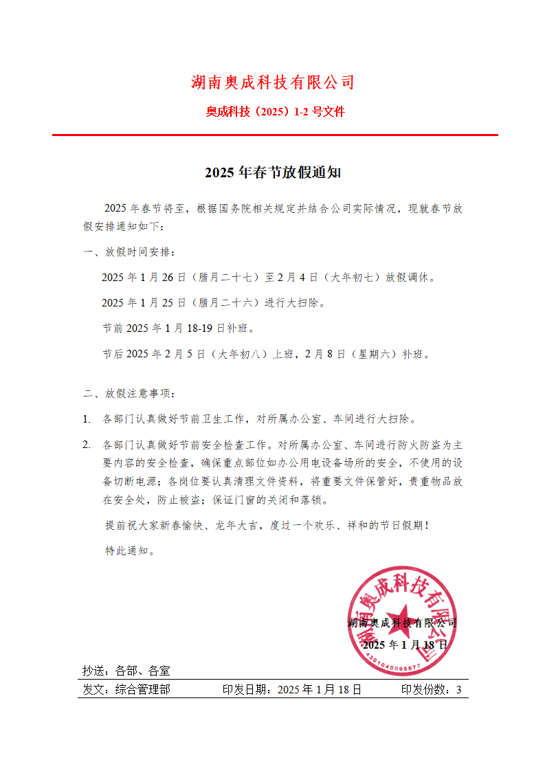 奧成科技春節(jié)放假通知