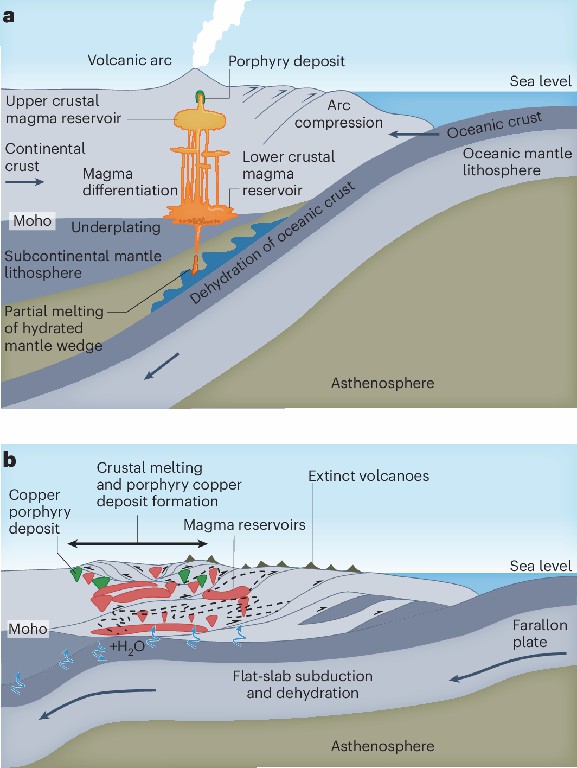 他們提出了一個新的斑巖銅礦形成模型:法拉隆板塊的平板俯沖導致其攜帶的揮發(fā)分(H?O, CO?, Cl, S)直接進入內(nèi)陸地殼底部,促使富含銅的鎂鐵質(zhì)和長英質(zhì)下地殼發(fā)生熔融,形成富含成礦元素的巖漿,最終導致斑巖銅礦的形成(圖3)。該模型不需要地幔楔的貢獻,很好地解釋了在平俯沖背景下斑巖銅礦的成因。
