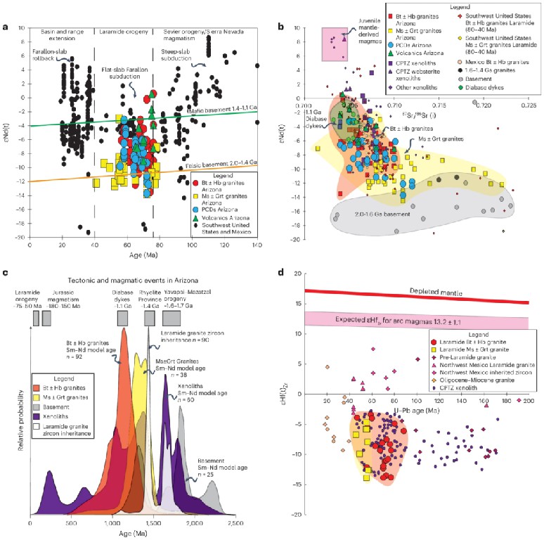 大約 80-40 Ma前的北美西部拉拉米造山帶為解決這一問題提供了一個絕佳的研究對象。因為這一造山運動與地殼增厚和巖漿活動相關,巖漿活動深入超過2000公里內(nèi)陸,并形成了世界上第二大斑巖銅礦床省。英國布里斯托大學Thomas Lamont與合作者通過匯編拉拉米花崗巖的地球化學和同位素數(shù)據(jù)(圖2),結合來自深部地殼出露的混合巖巖石學和地質(zhì)年代學約束,為了解地殼的重熔作用和平板俯沖在拉拉米斑巖銅礦省形成中的作用提供了關鍵見解。