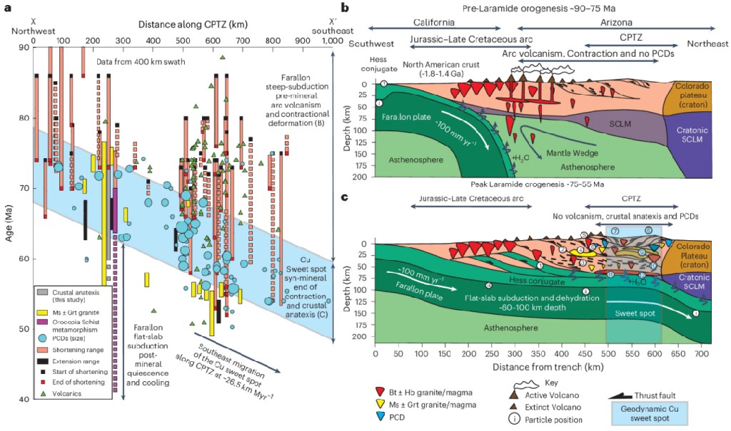 銅對于傳統(tǒng)工業(yè)向綠色能源轉型意義重大。斑巖銅礦床(porphyry Cu deposits, PCD)提供了人類所需75%的銅、50%的Mo、20%的Au及大部分Re。面對日益增長的Cu消耗,斑巖銅礦成礦理論突破迫在眉睫。傳統(tǒng)觀點認為俯沖型斑巖銅礦成礦物質(zhì)主要來自地幔楔部分熔融,但該模型無法解釋平板俯沖背景下斑巖銅礦的成因機制。針對該問題,英國布里斯托大學Thomas Lamont與合作者選取與平板俯沖作用密切相關的全球第二大斑巖銅礦省——美國亞利桑那州晚白堊世-古新世拉拉米造山期(Laramide orogeny)的斑巖銅礦省作為研究對象,綜合地質(zhì)年代學(geochronology)、Nd-Hf同位素地質(zhì)學和地質(zhì)溫壓計(thermobarometry)方法,并結合深部地殼的巖石學和礦物學證據(jù),重建了該區(qū)域地殼熔融和斑巖銅礦形成的過程,最后提出了一個開創(chuàng)性的理論,即在平板俯沖背景下板片前緣脫揮發(fā)分導致古元古代下地殼熔融對斑巖銅礦床的形成起著至關重要的作用。該研究挑戰(zhàn)了傳統(tǒng)模型,是俯沖帶斑巖銅礦成礦的一種新的機制。